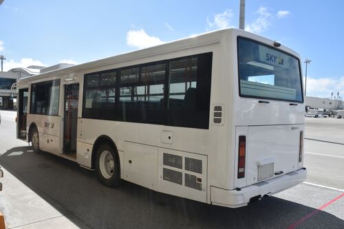 那覇空港内のスカイマーク用ランプバス。元西武バスのRA。ノンステップエリアの席が殆ど撤去されている他、車外のステッカー類が全て剥がされて真っ白。乗合では使わないので、通常は残す車椅子マークすらない。